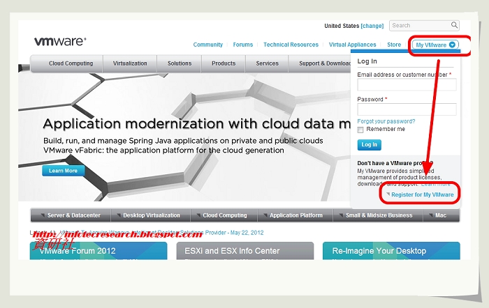 2.點選 [My VMware]後,點選 [Register for My VMware]註冊新帳號